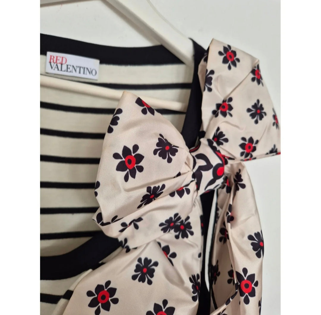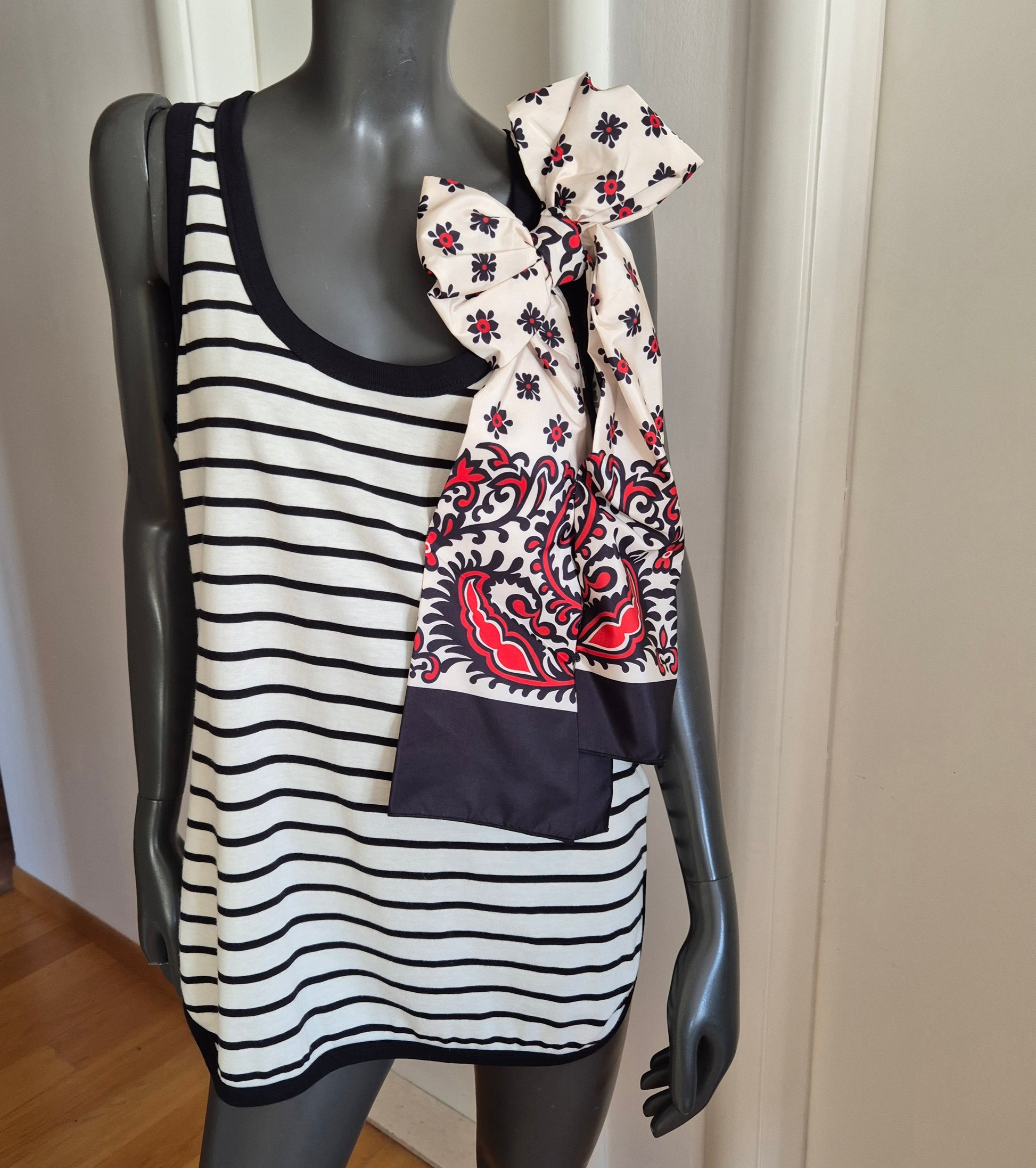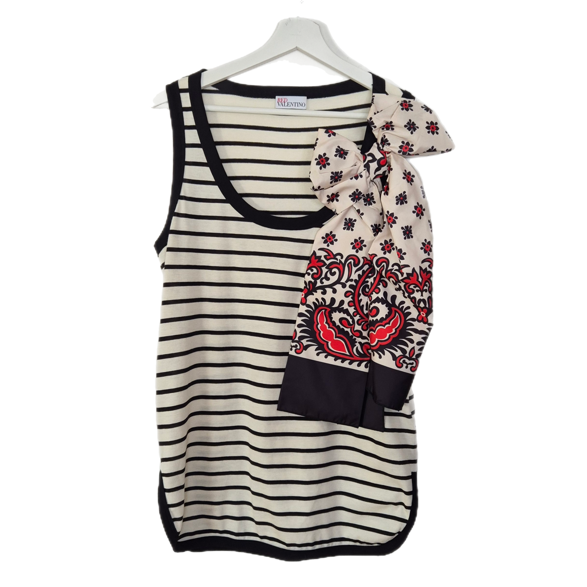 Valentino Garavani - Red Valentino. Majica/top. Pamuk s prljavobijelim/beige i crnim prugama. Na ramenu našivena bogata šarena mašna.