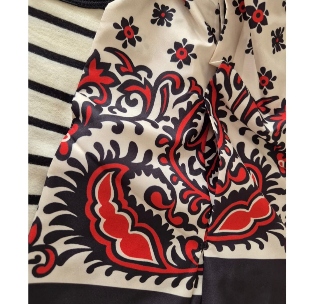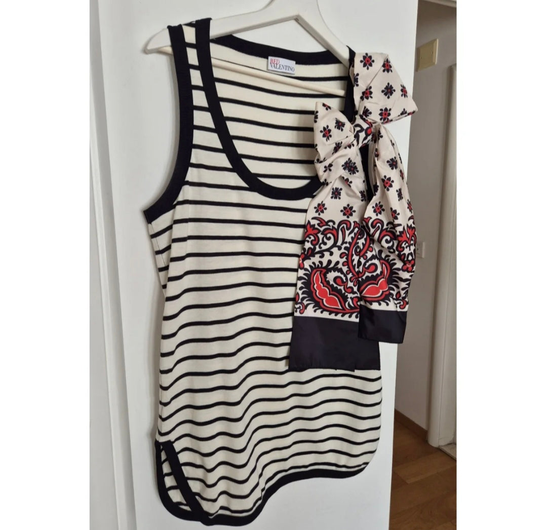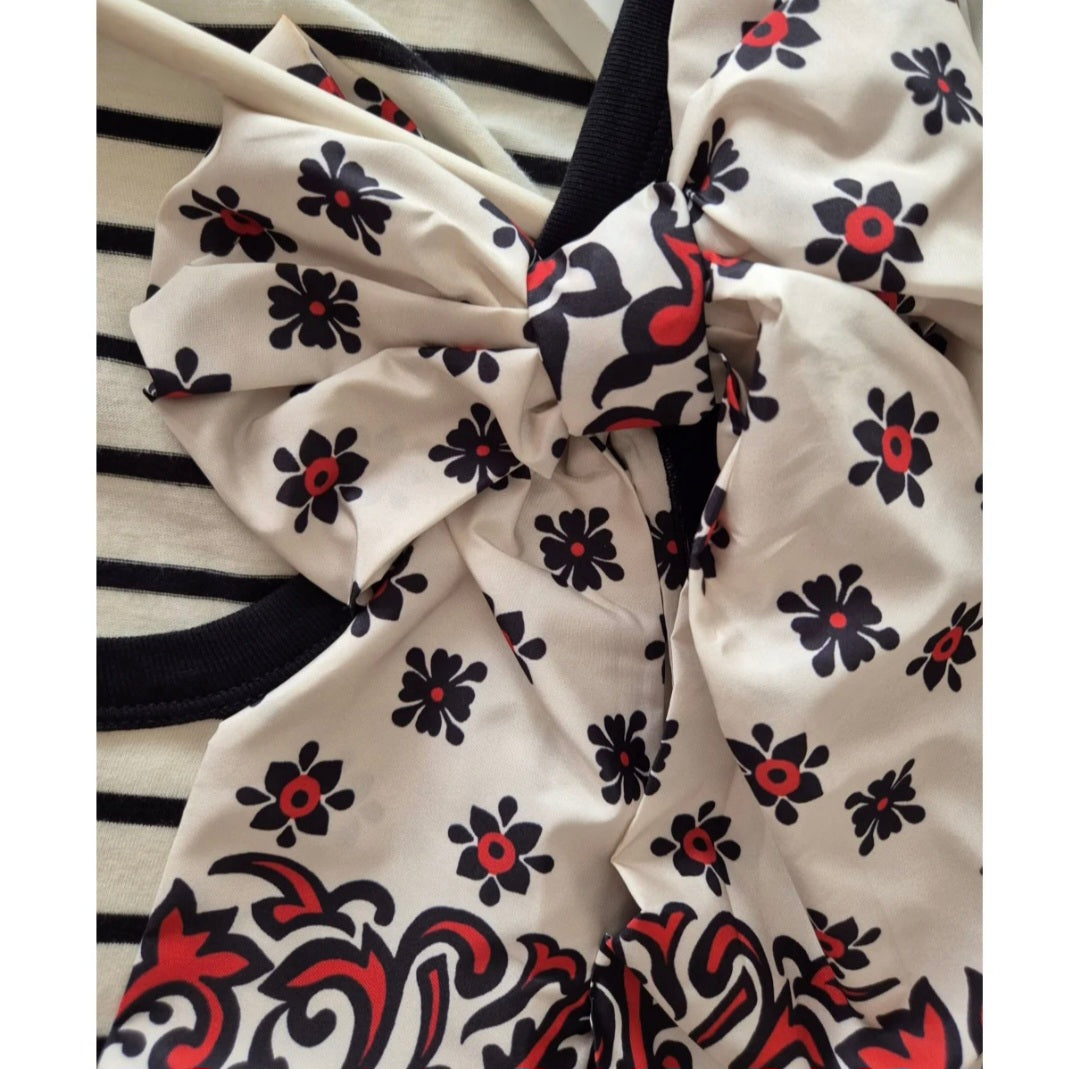 Valentino Garavani - Red Valentino. Majica/top. Pamuk s prljavobijelim/beige i crnim prugama. Na ramenu našivena bogata šarena mašna.