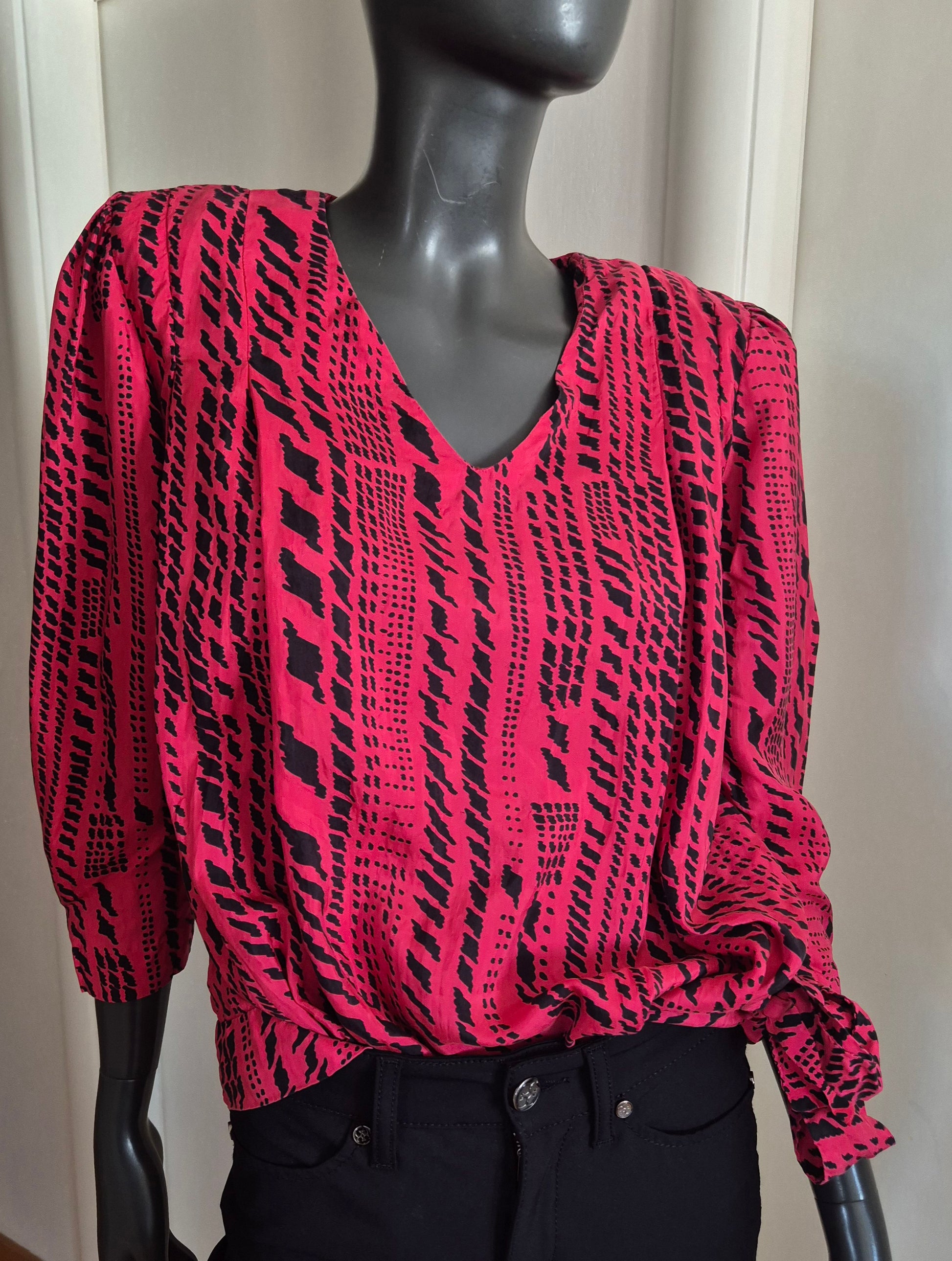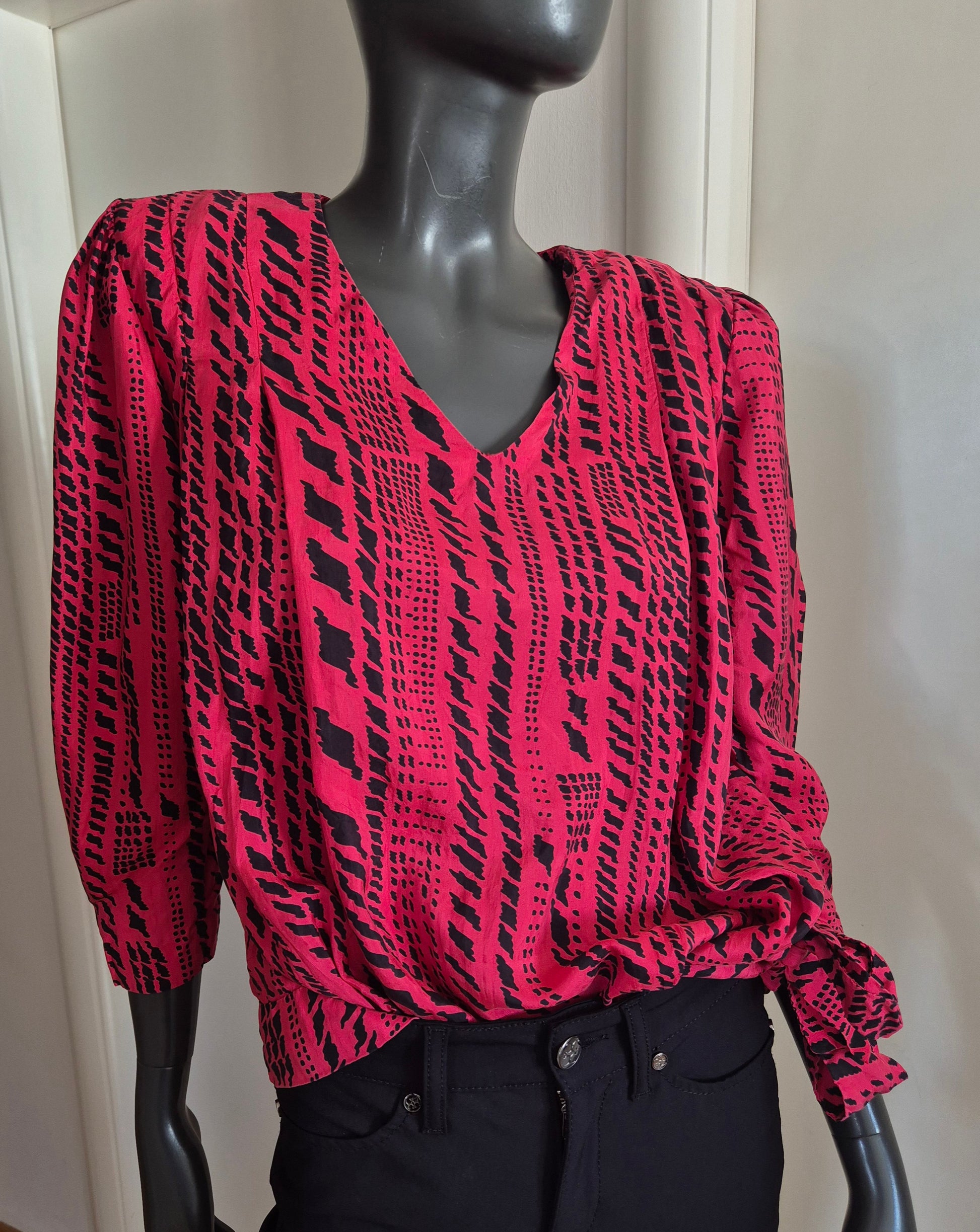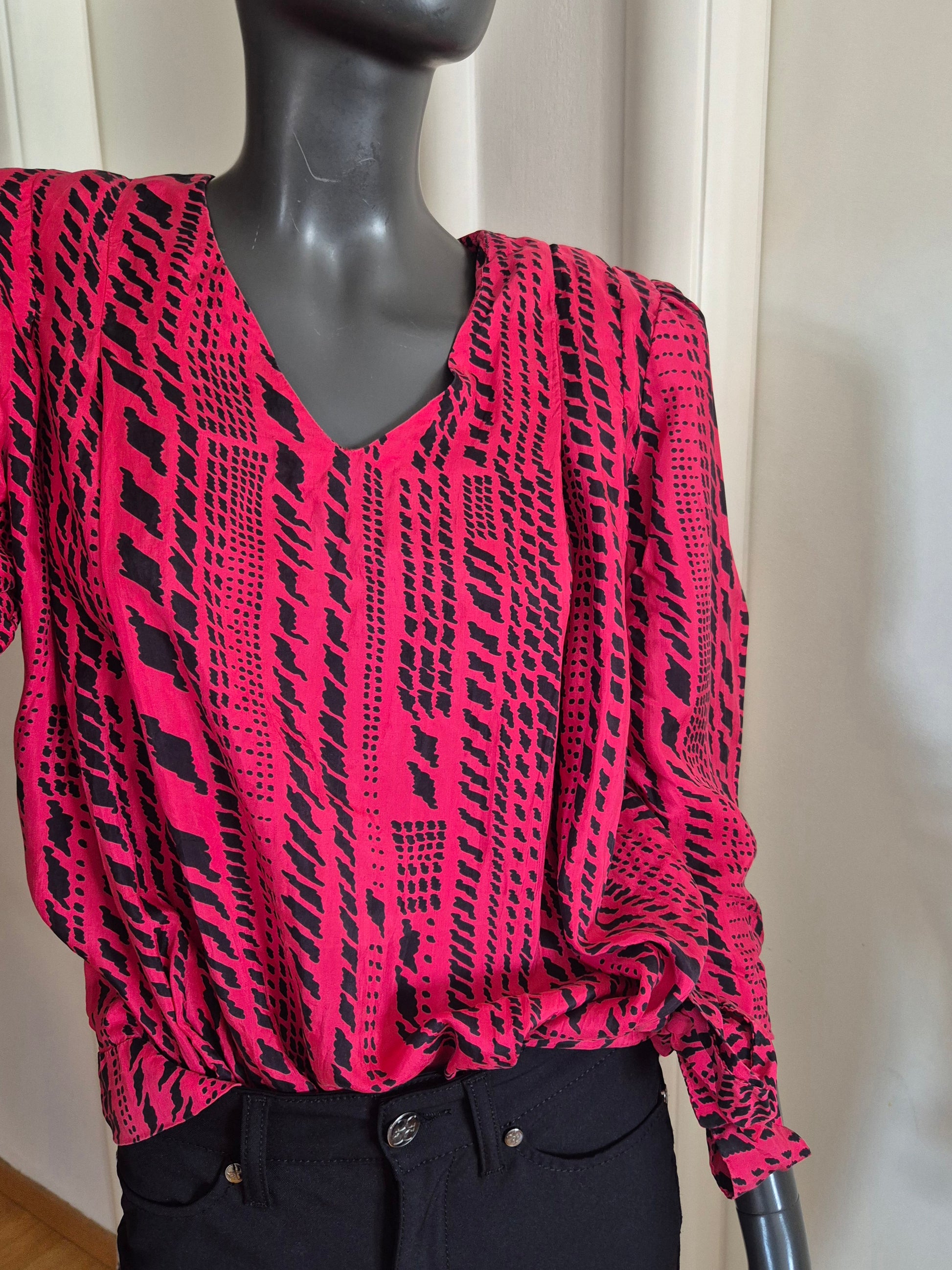 Vintage bluza od čiste svile. Zagasita fuksija s crnim 🖤. Jako dobro krojena. Jastučići na ramenima, rukavi pri dnu malo nabrani (time uži), na dnu trakica koja može ići u mašnu. Veoma posebna!