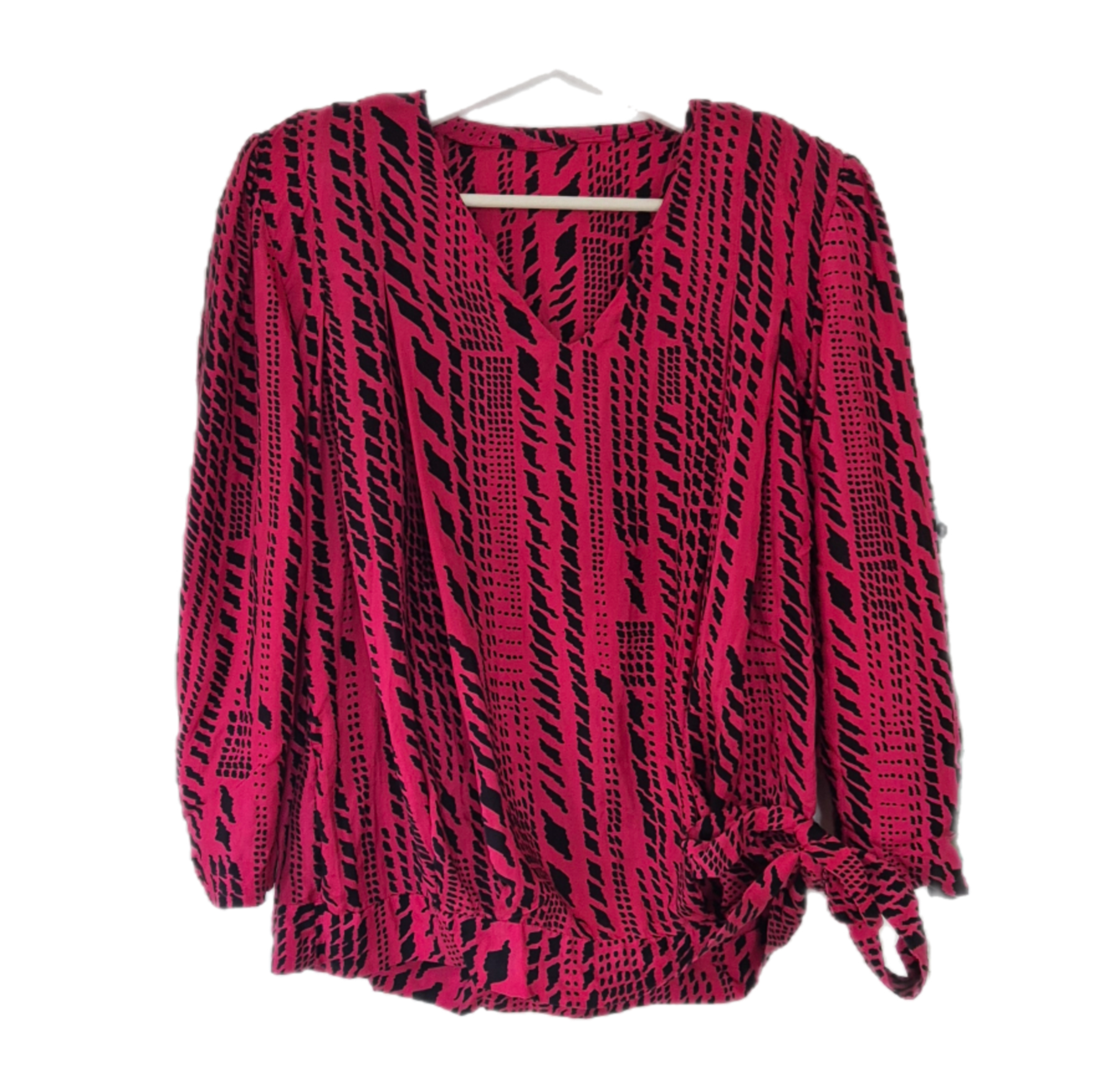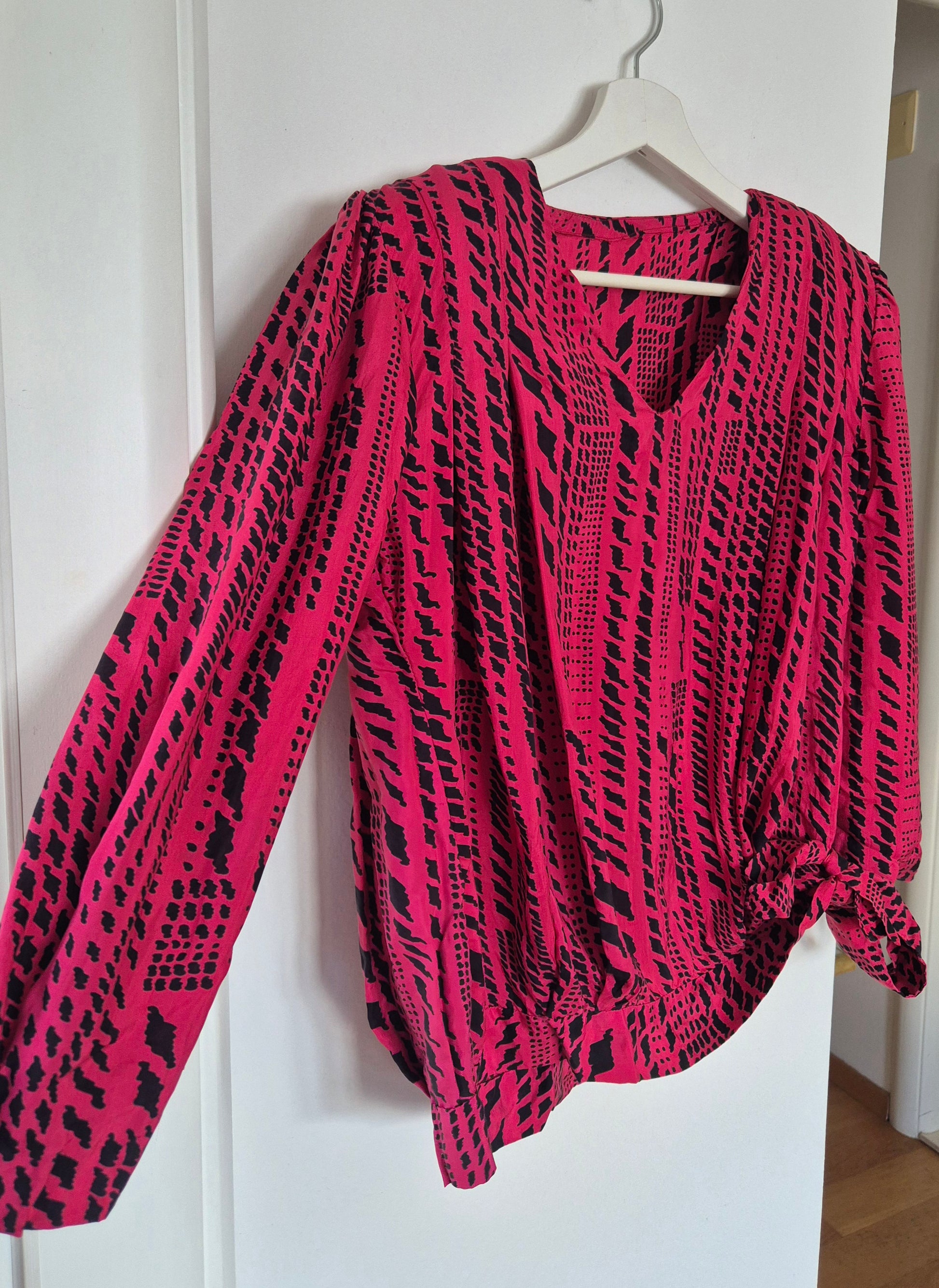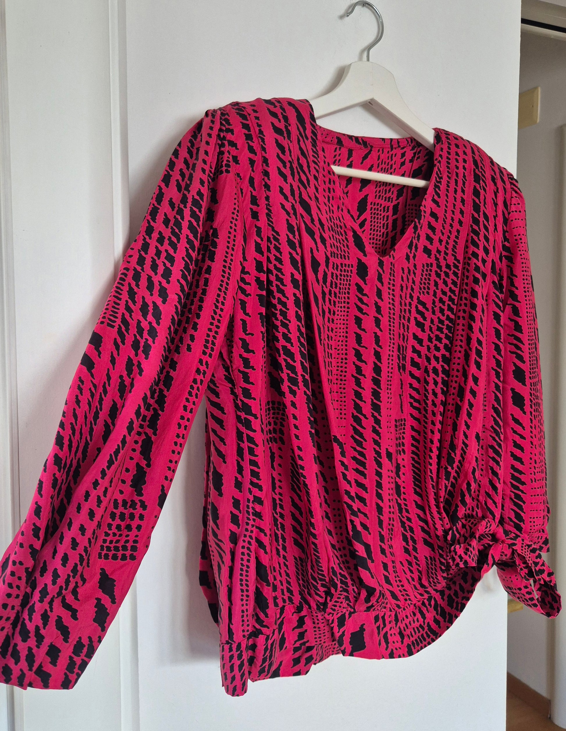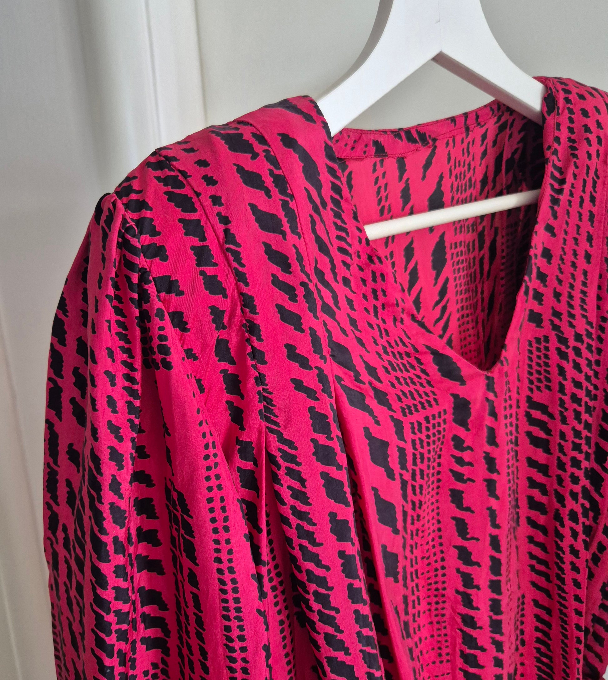Vintage bluza od čiste svile. Zagasita fuksija s crnim 🖤. Jako dobro krojena. Jastučići na ramenima, rukavi pri dnu malo nabrani (time uži), na dnu trakica koja može ići u mašnu. Veoma posebna!