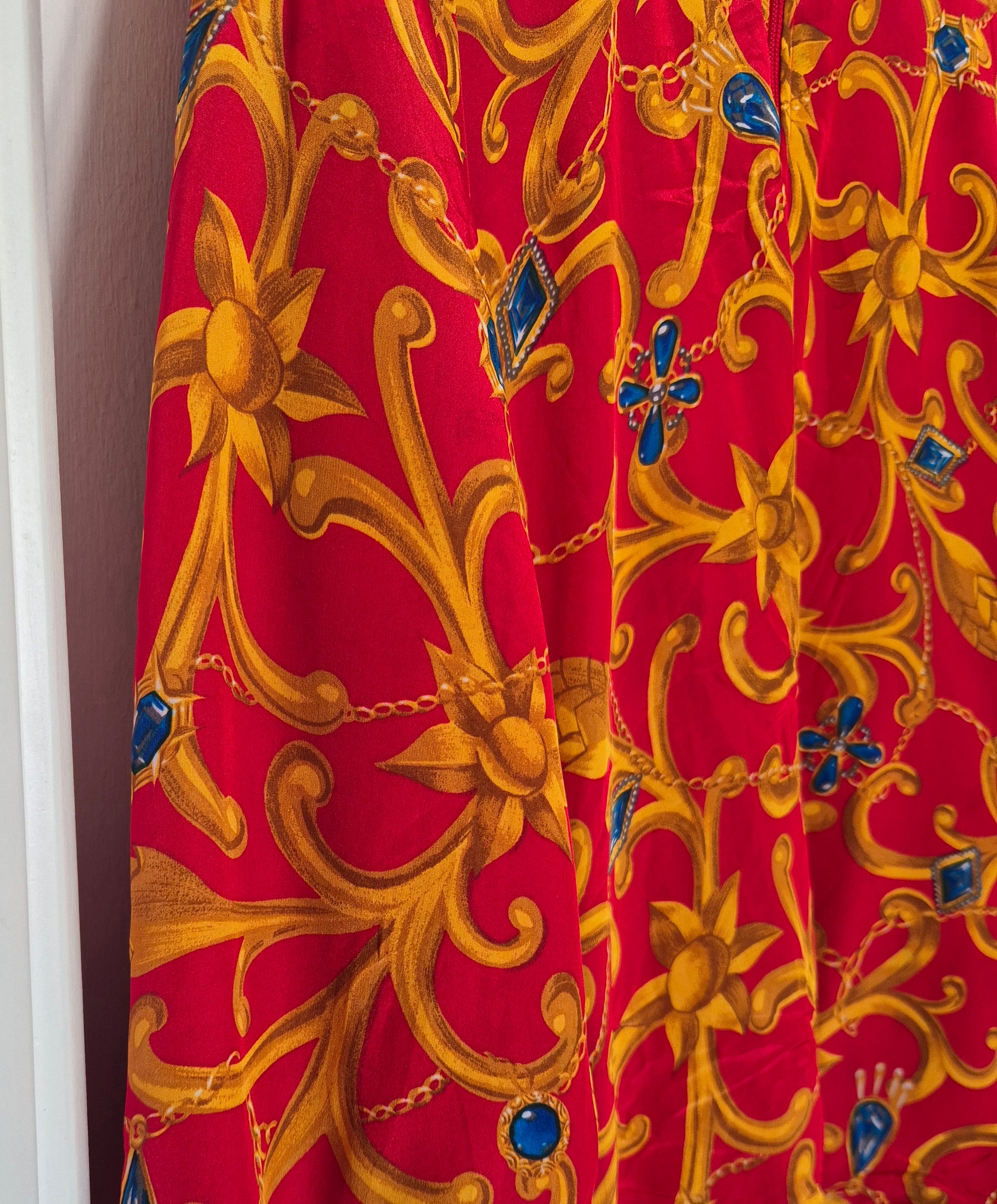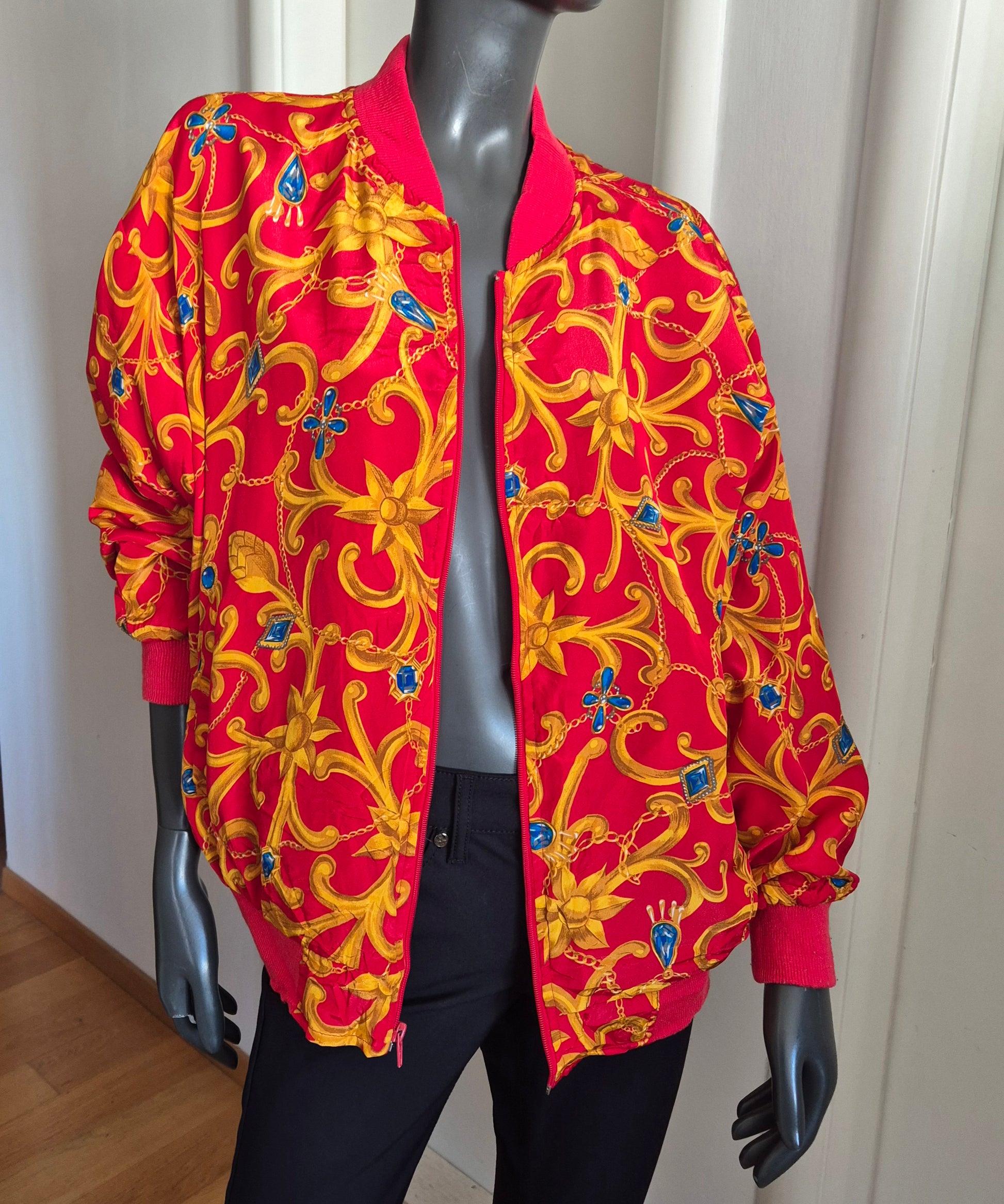Crvena s uzorkom, vintage bomber jakna. Savršen uzorak ❤️. Pleteni rubovi (ovratnik, dno, dno rukava). Materijal fini poliester.