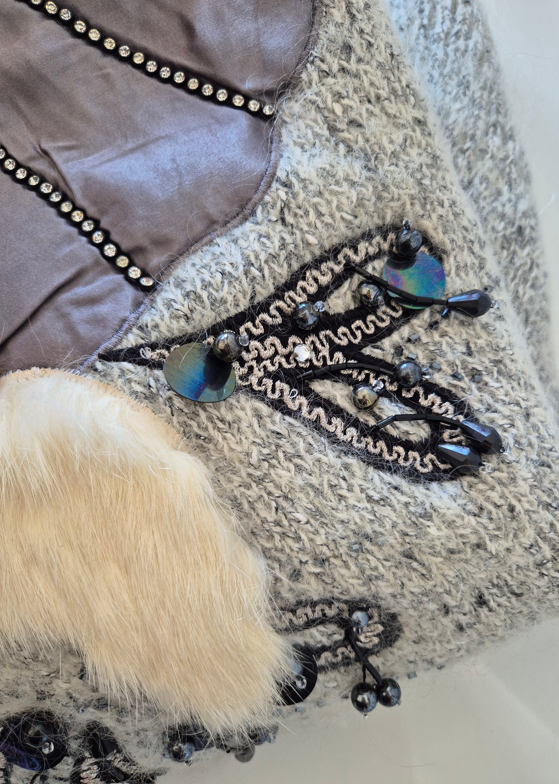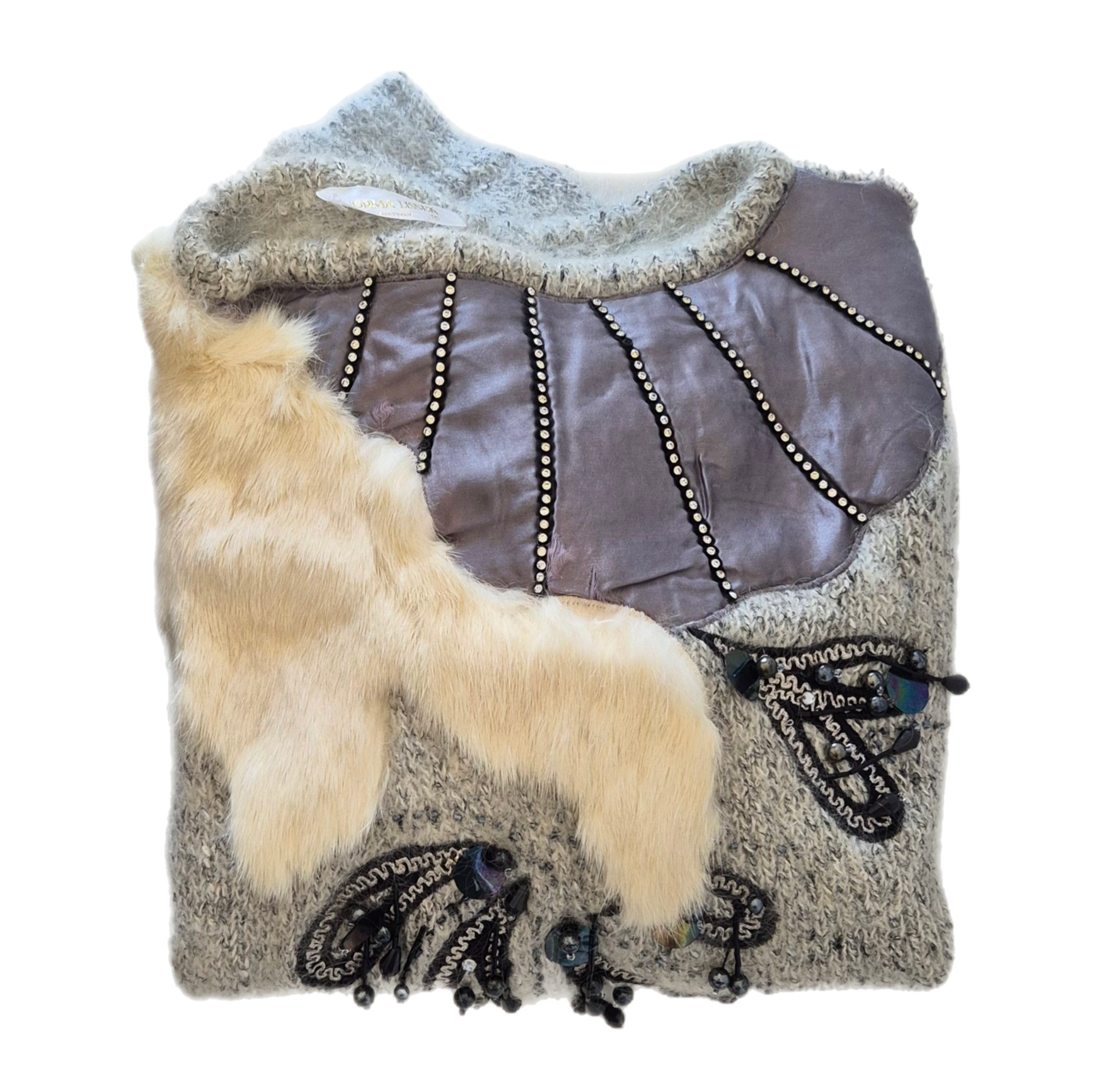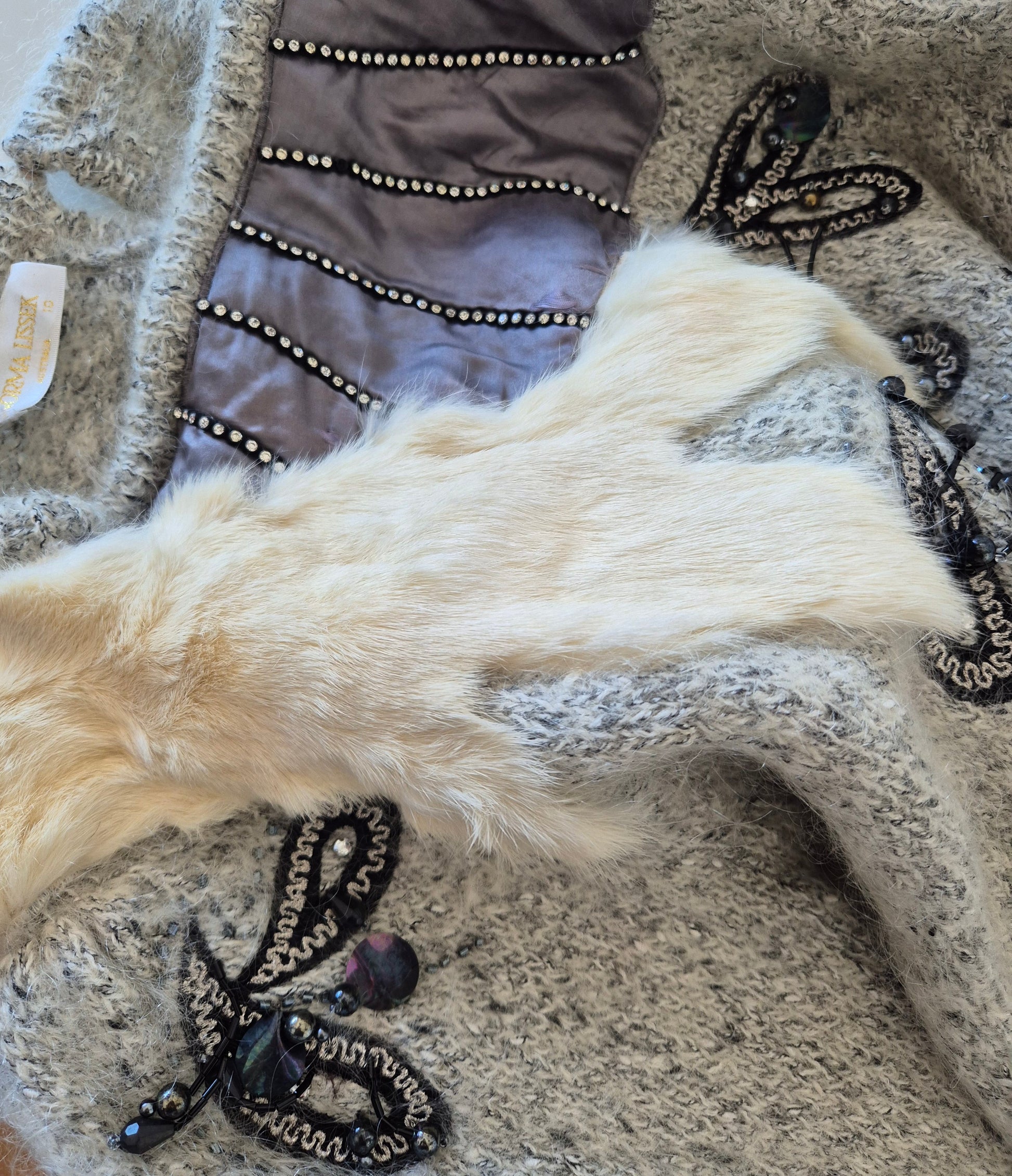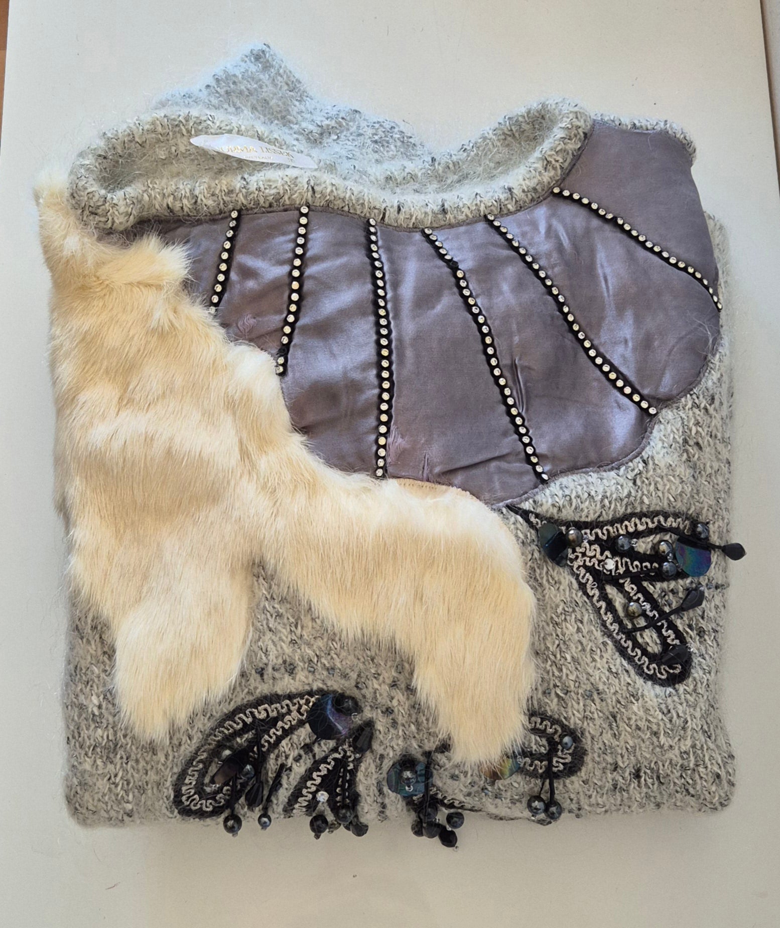 Preposeban vintage pulover, vuna i moher. Dizajnerica Norma Lissek, 80s komad. Prošarano siva. Detalji od krzna (prirodnog), sive svile sa štrasom, veza s perlicama, ... Made in Australia.
