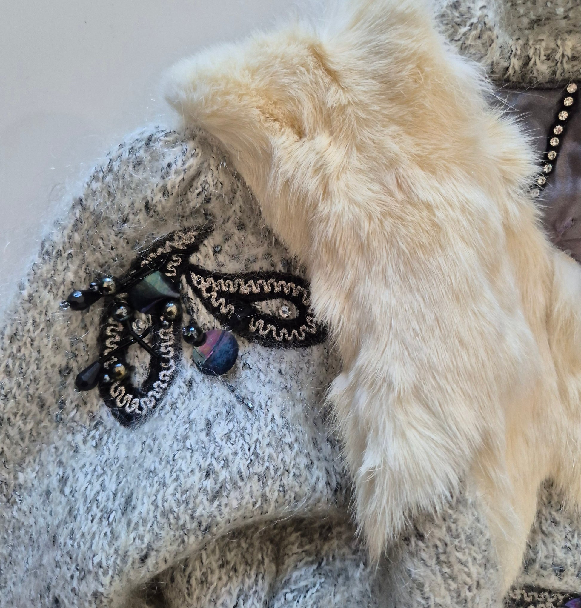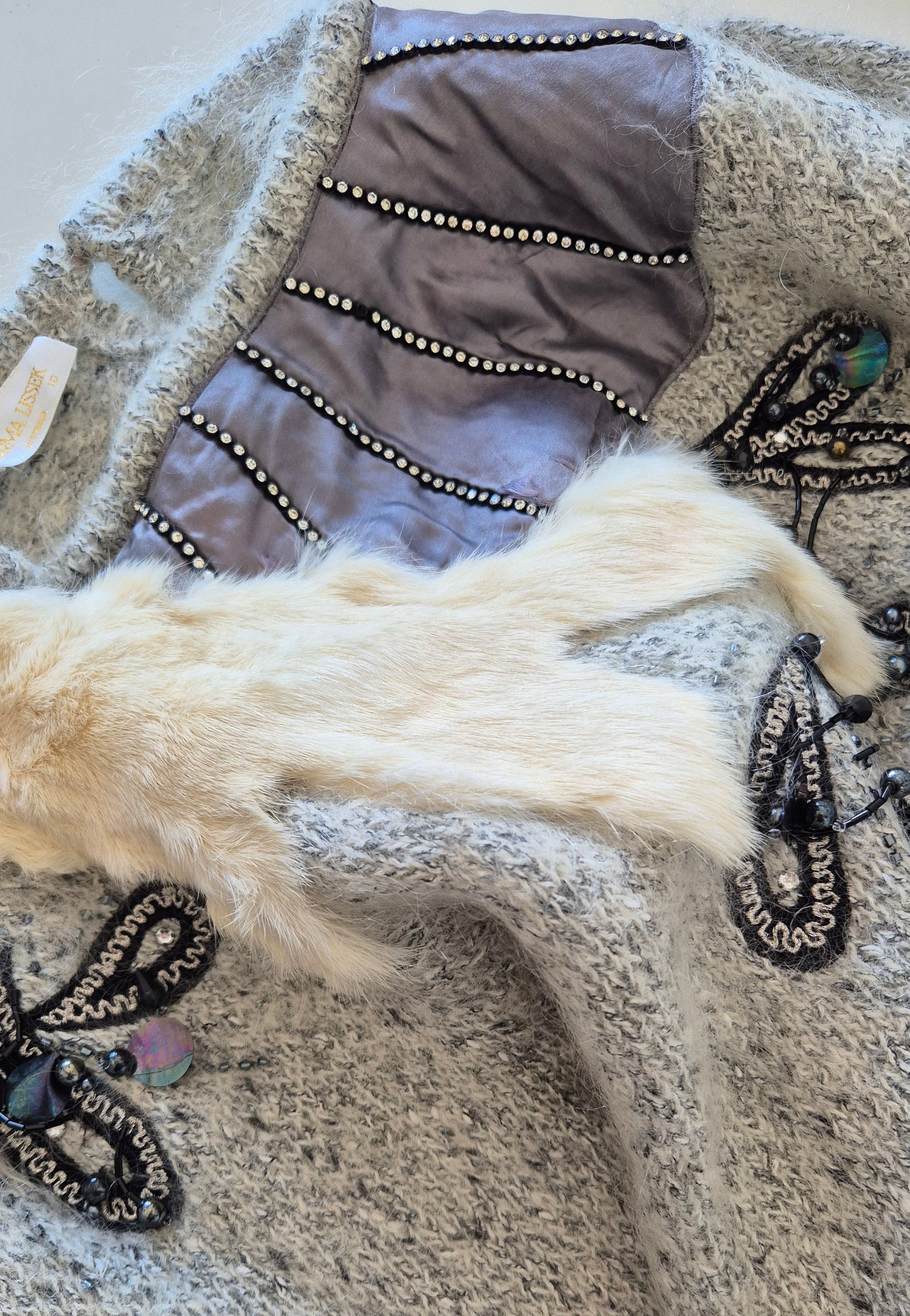 NORMA LISSEK 80s vintage dizajnerski pulover od vune i mohera, s detaljima od krzna, svile i perlica
