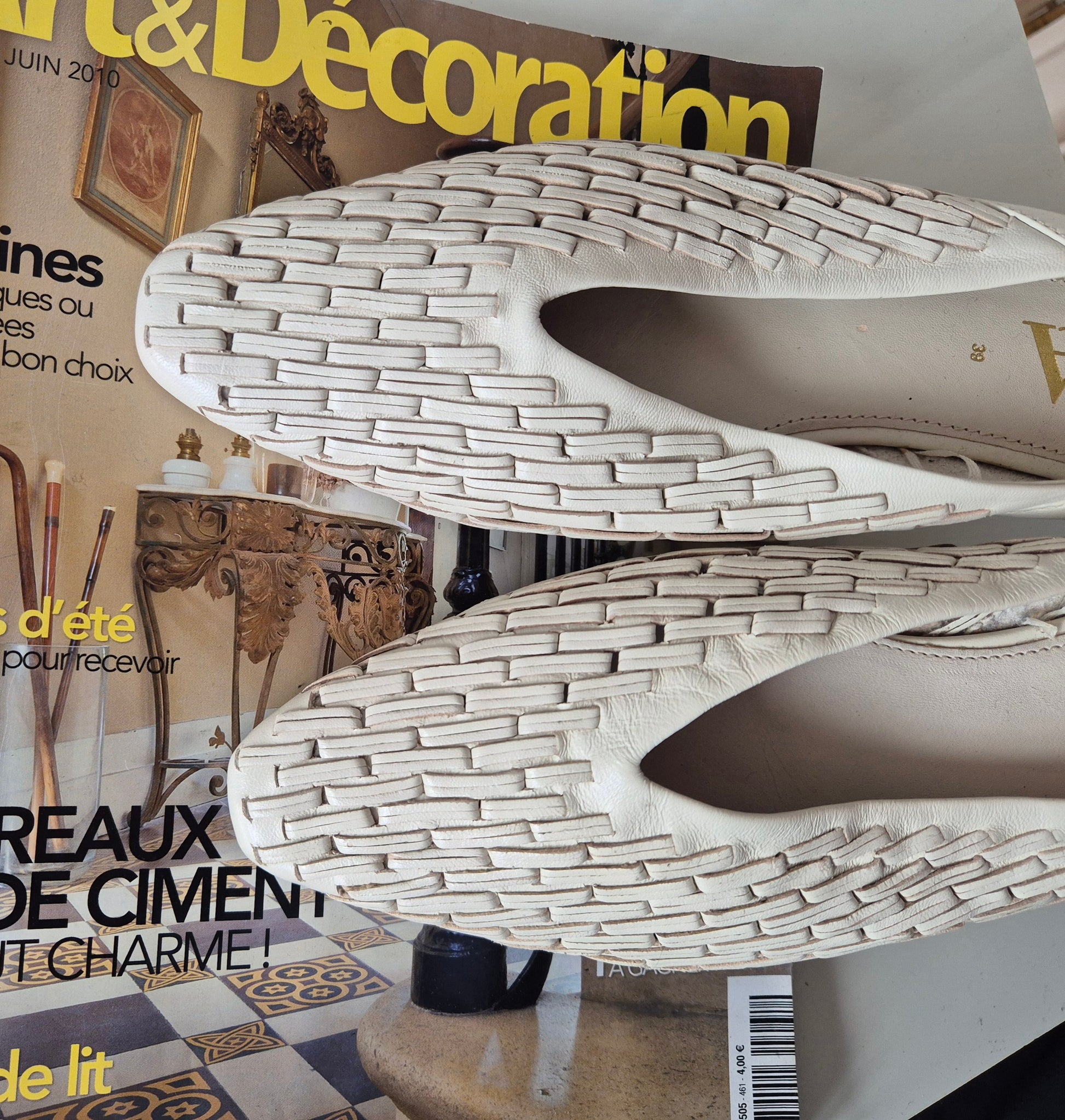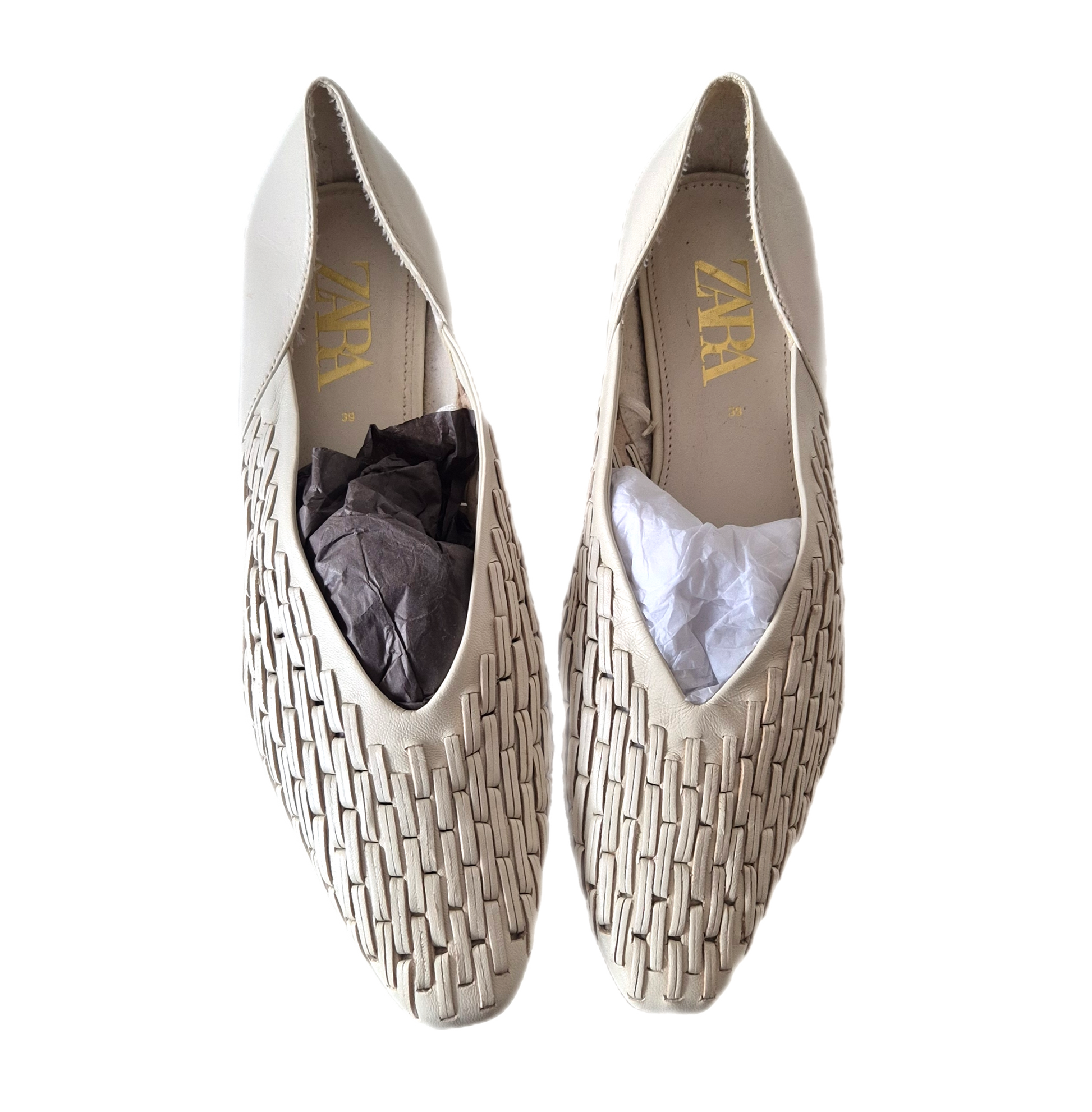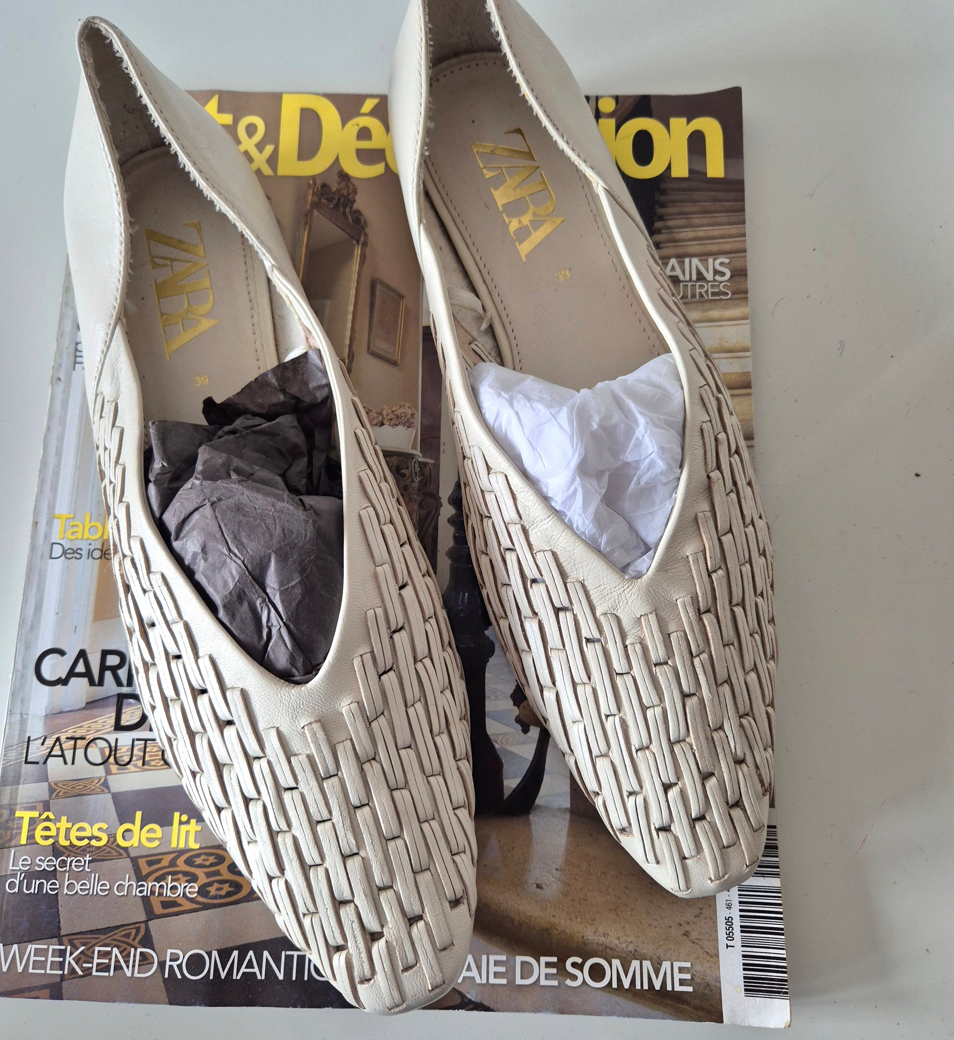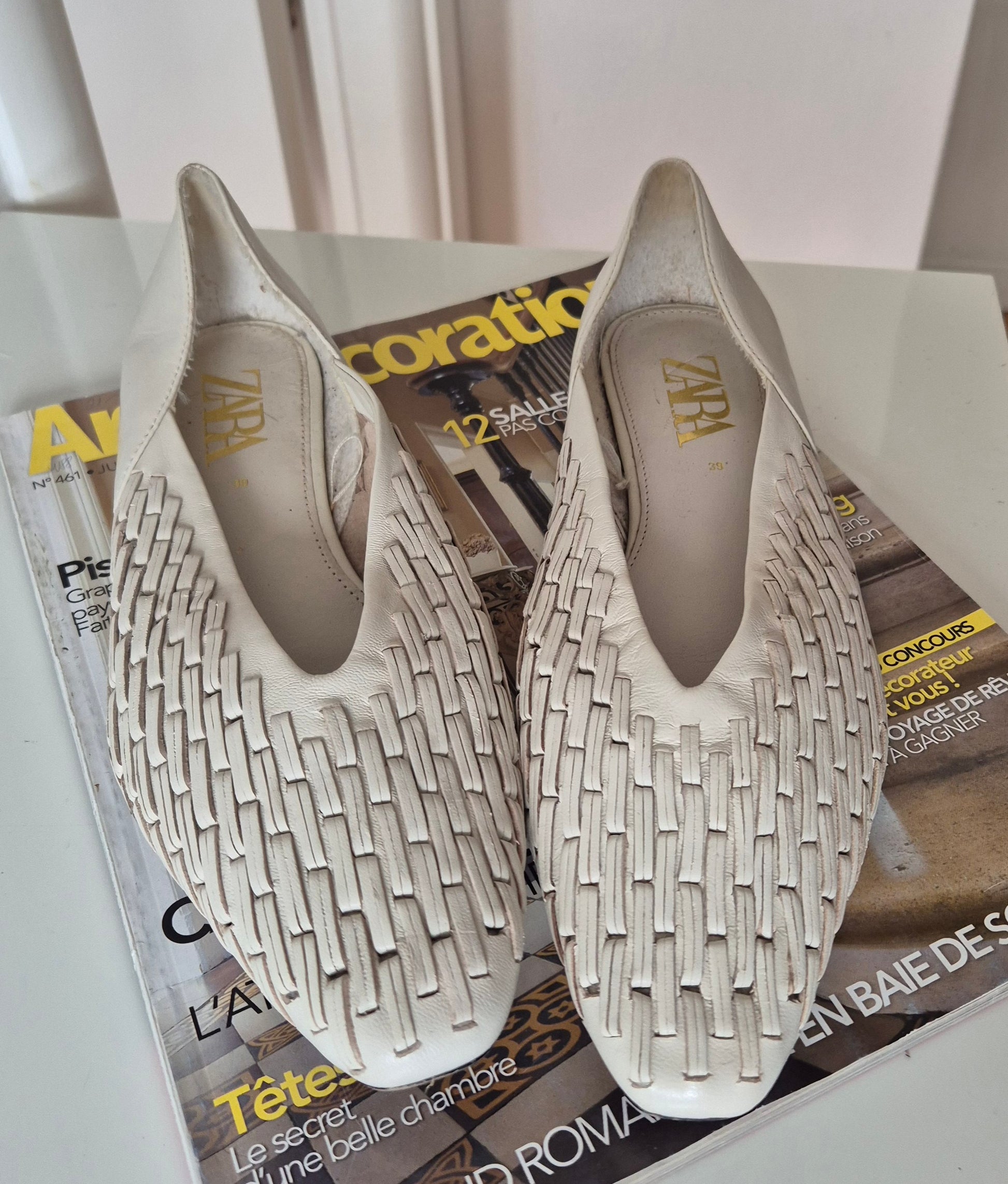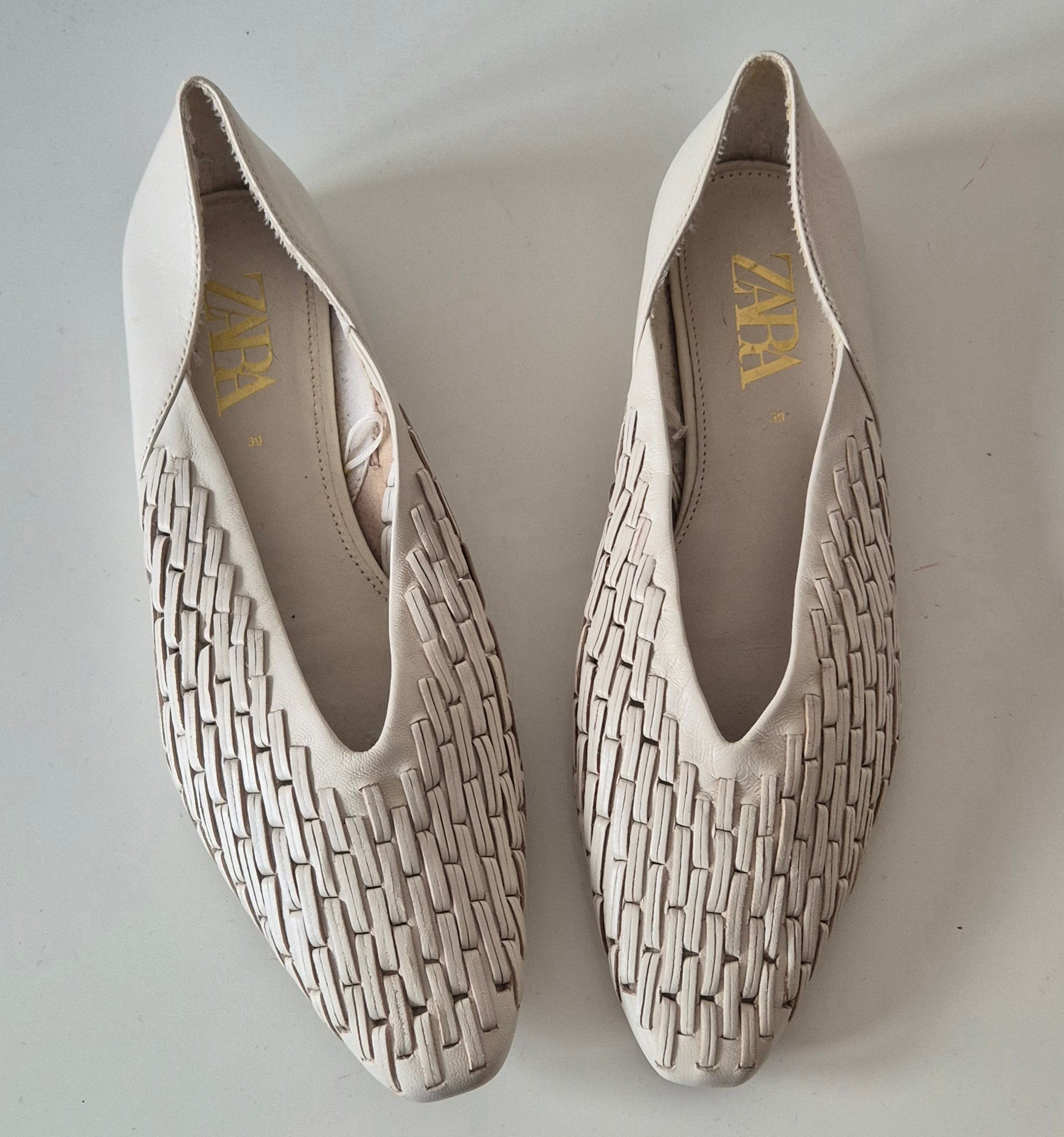 Zara balerinke, prljavobijele, koža (naprijed pletena). Lagane i udobne.